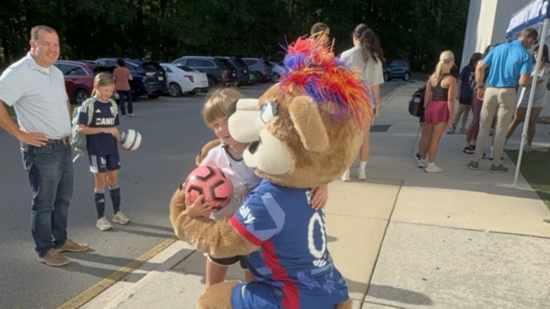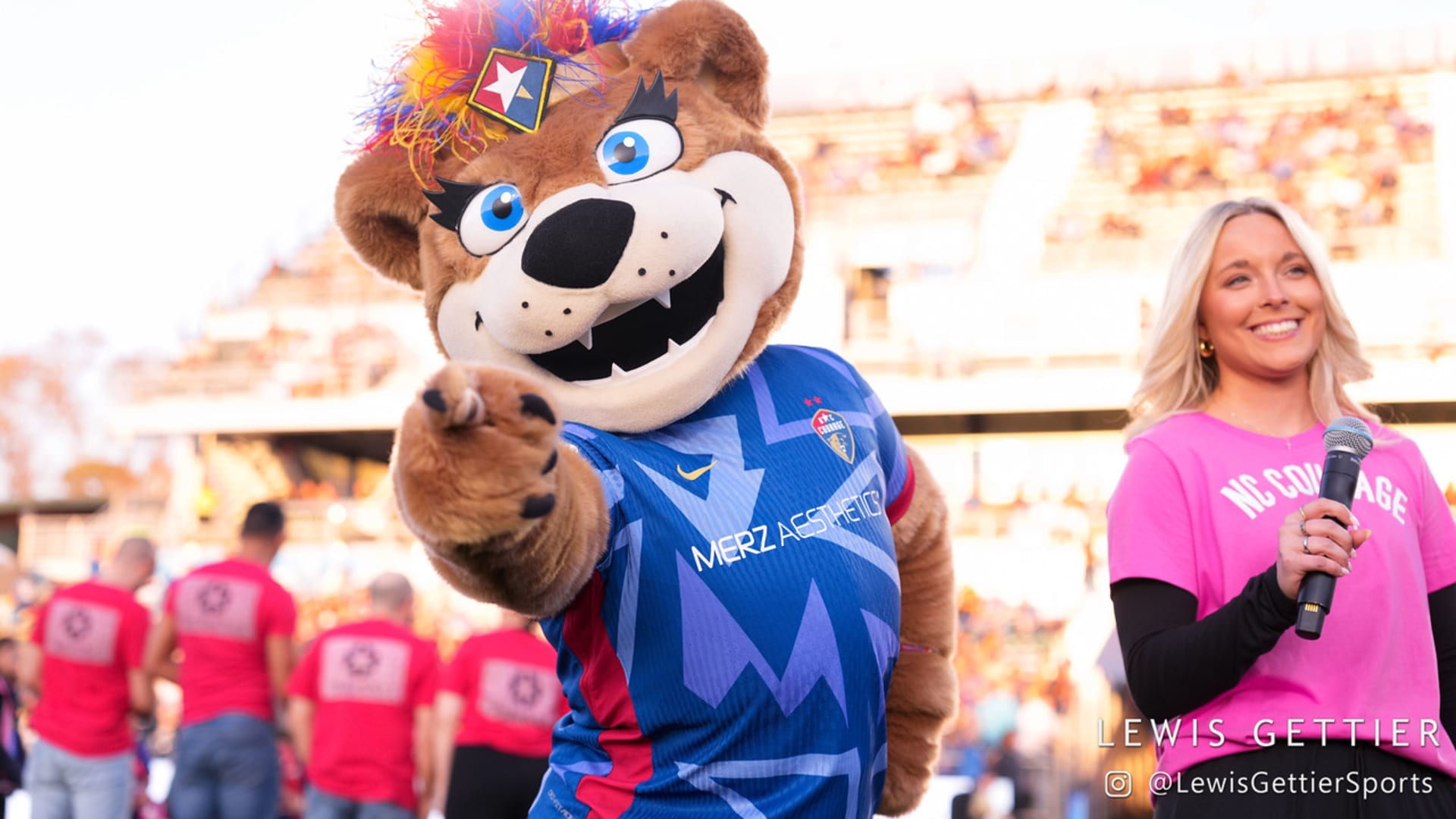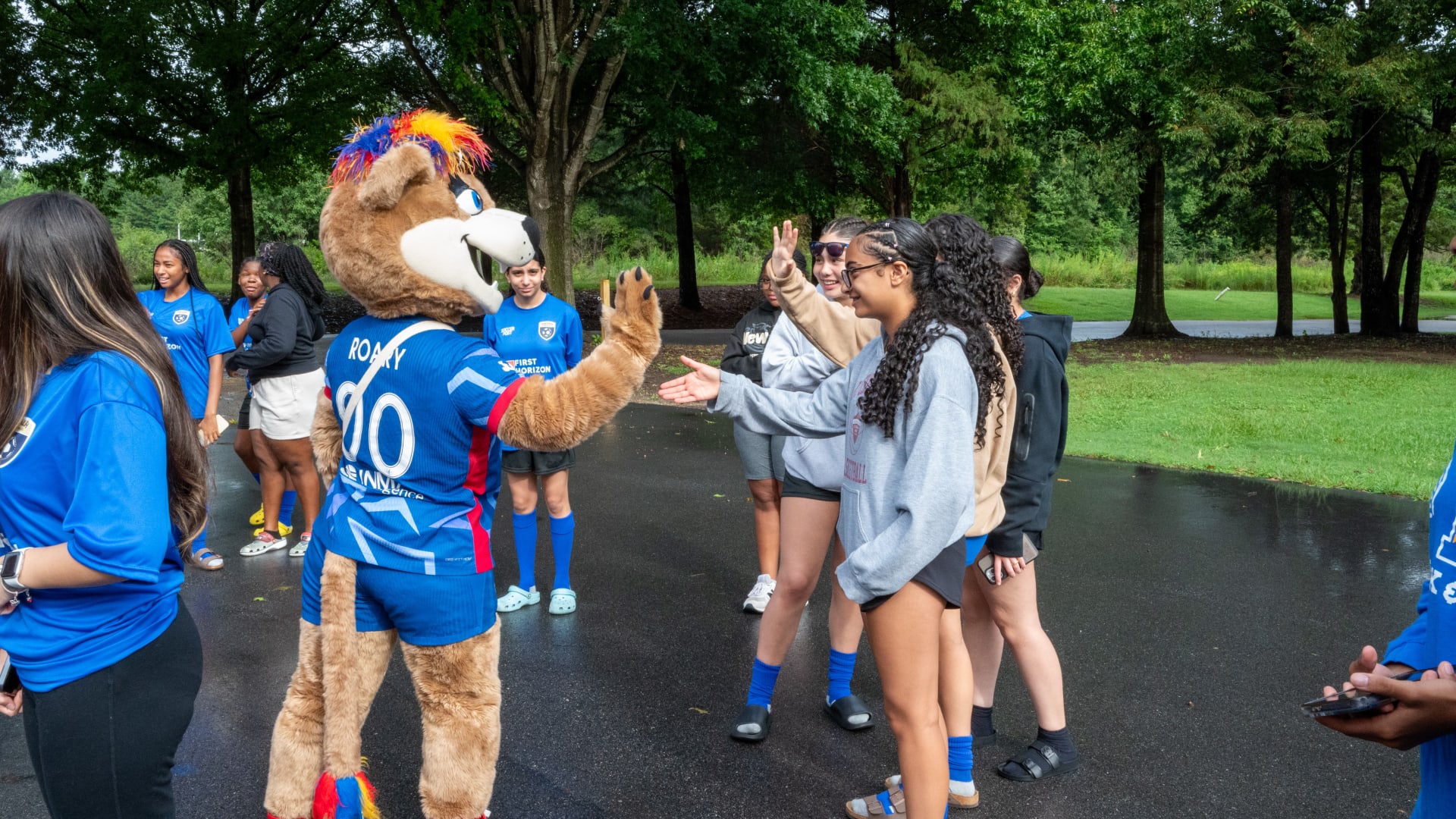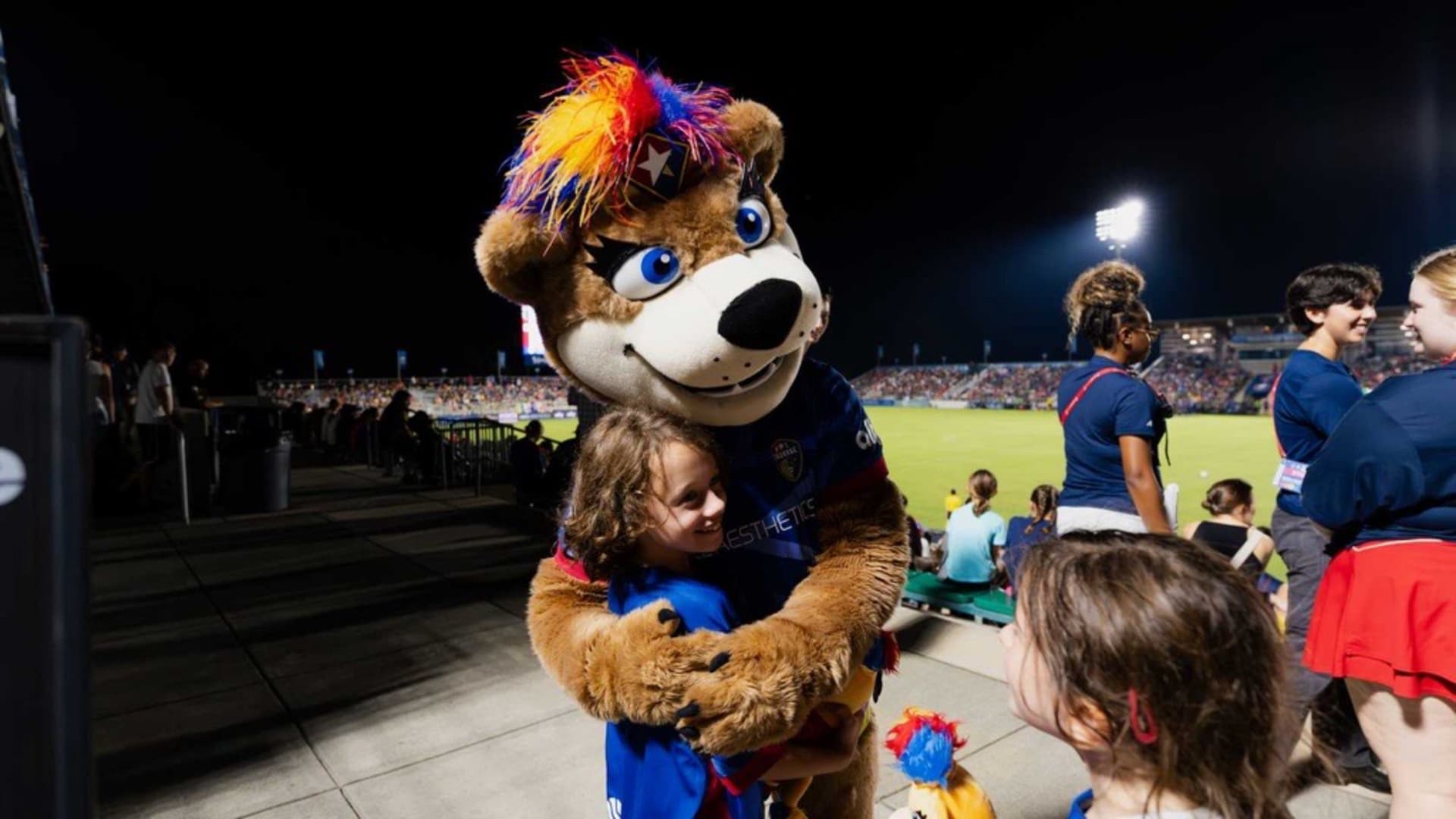 Over time, Roary became a local celebrity, making fast friends with fellow mascots like Wool E. Bull of the Durham Bull and Stormy the Ice Hog of the Carolina Hurricanes. She also formed a special connection with the NCFC Youth players, who she calls her “best friends for life.” Whether she’s on the sideline cheering or out in the community, Roary brings smiles, high fives, and plenty of hugs.